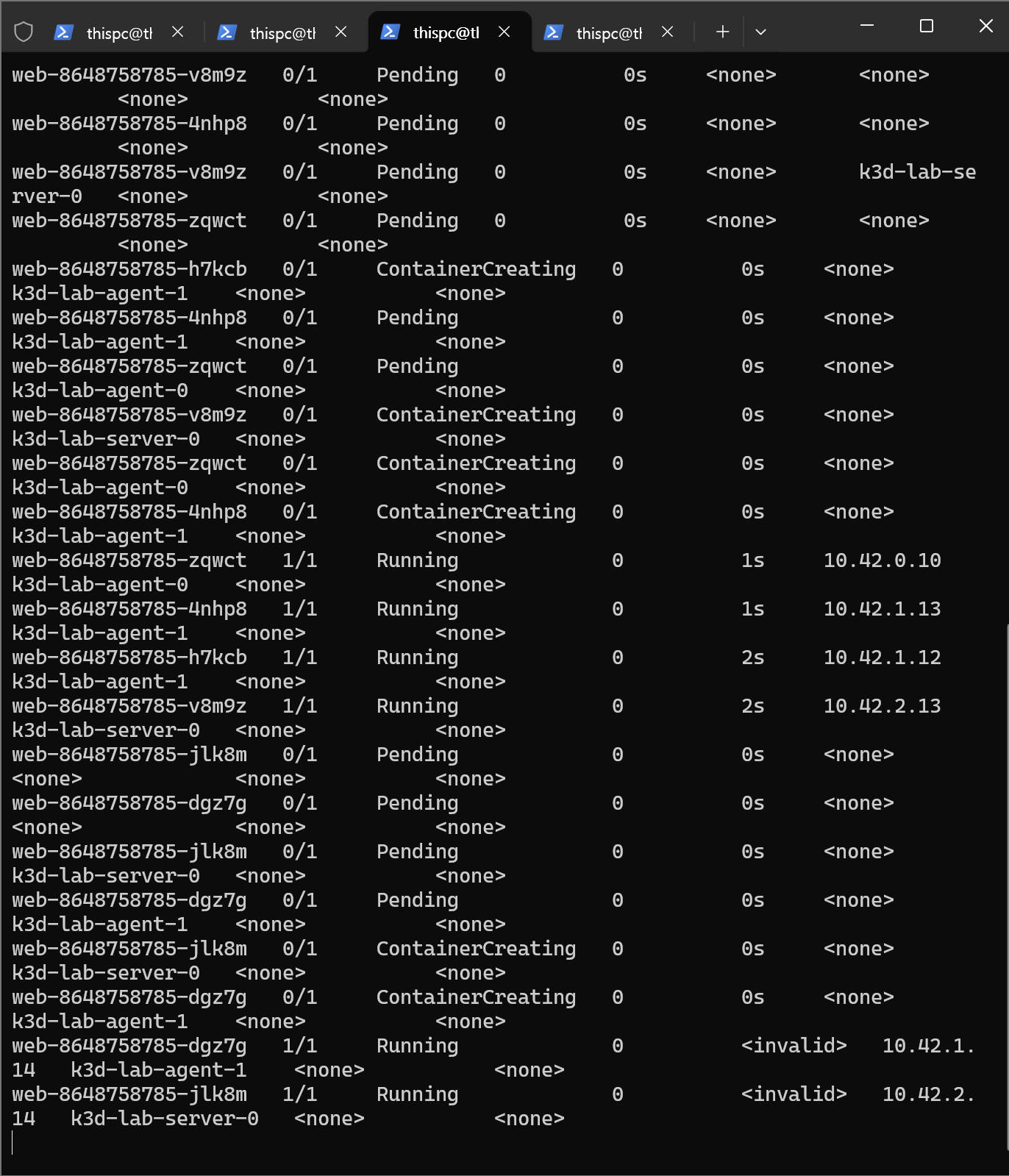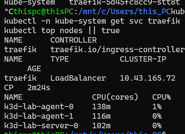 k3d-lab-agent-1 Ready <none> 31s v1.31.5+k3s1 172.18.0.4 <none> K3s v1.31.5+k3s1 6.6.87.2-microsoft-standard-WSL2 containerd://1.7.23-k3s2