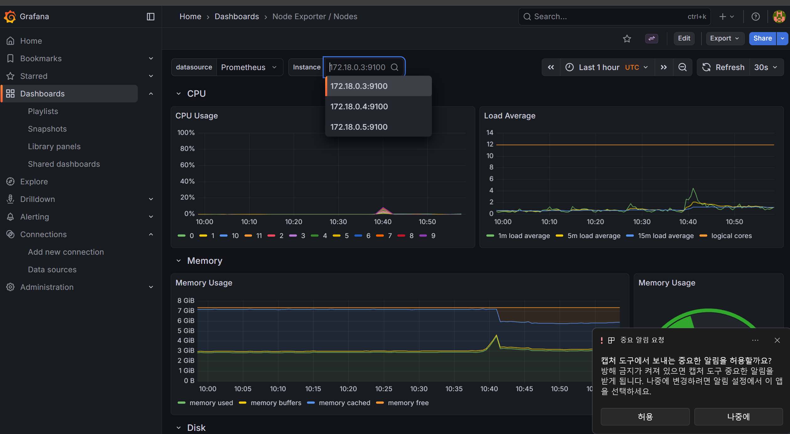 연동된 대시보드의 모습 컨트롤 + K 로 "nodes" 를 검색해 추가 했다