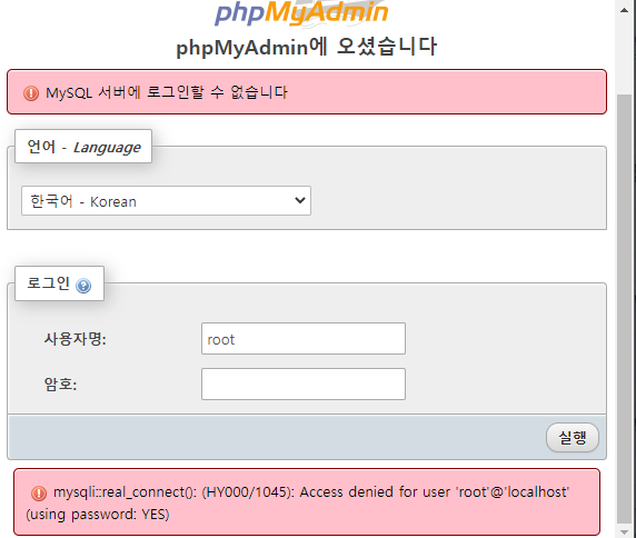 그후 phpmyadmin에서 root 접속을 시도