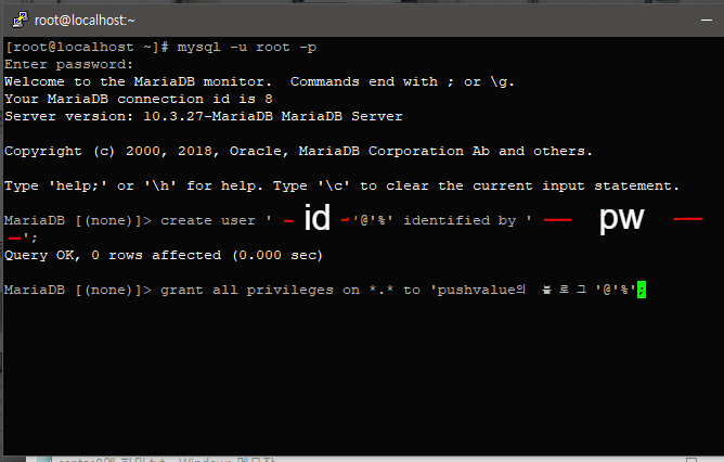 grant all privileges on *.* to '아이디'@'%';