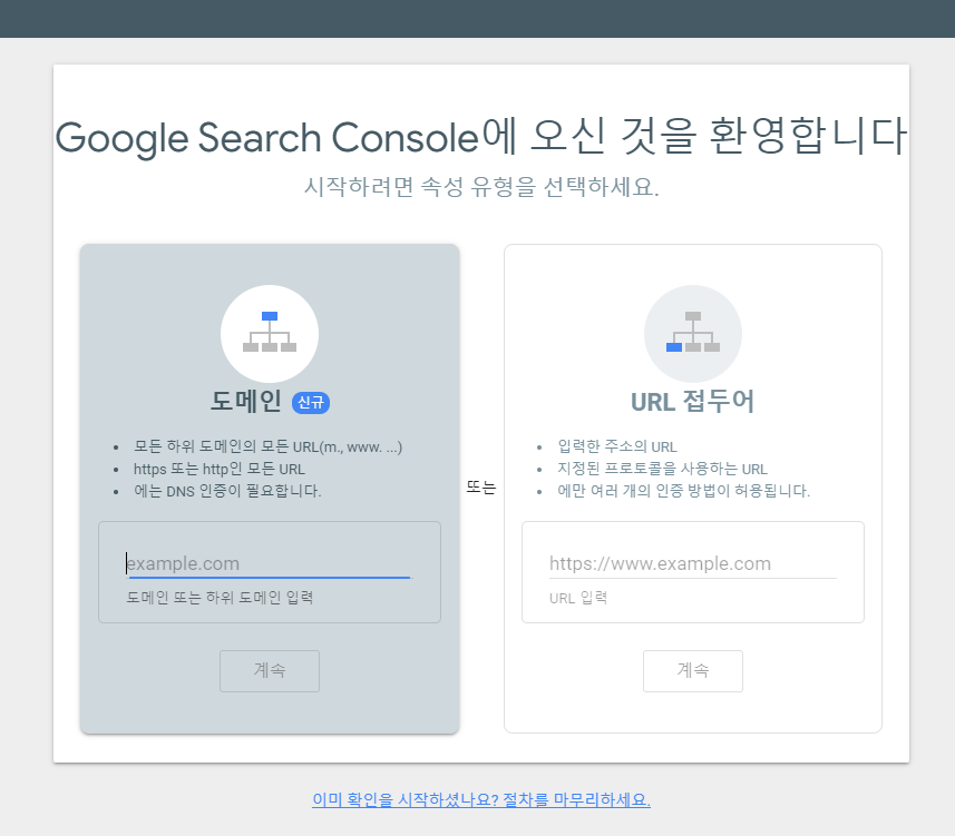 우선 구글 서치 콘솔에 내 블로그 주소를 올리고 자신의 소유라는 검증을 받아야 한다