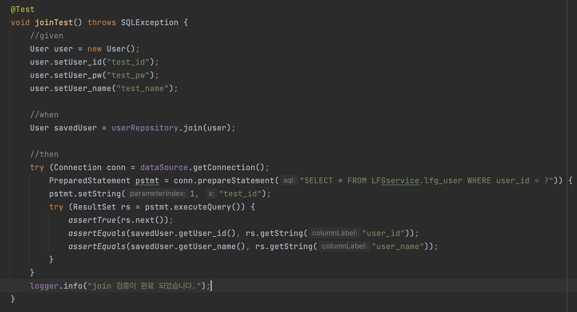 그후 then 부분의 select로 같은 객체를 다시 조회 하면서 join() 이 정상적으로 동작했는지 검증하는 방식이다